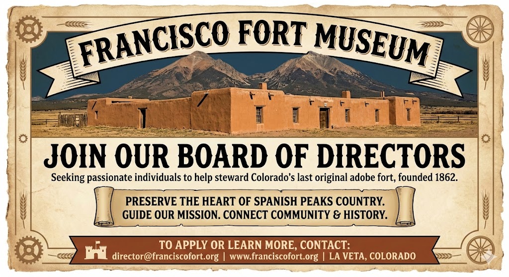 The Town of La Veta is currently accepting letters of interest for positions on the Francisco Fort Museum Board. Candidates must demonstrate an interest, competence or knowledge in La Veta History. This is a volunteer position. Letters of interest may be submitted to the Town of La Veta, PO Box 174, La Veta, CO 81055 or hand delivered to Town Hall, 209 S Main St, La Veta or email to [email protected]. Mark the envelope Francisco Fort Museum Board member.